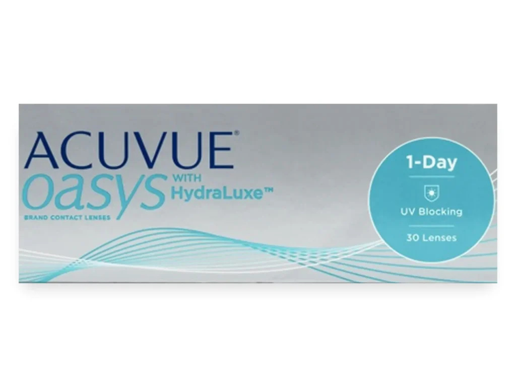 ACUVUE® OASYS 1-DAY with HYDRALUXE contact lenses are premium daily disposable silicone hydrogel lenses designed for busy, screen-heavy days and dry environments like aircon, wind, or long hours. HYDRALUXE™ Technology is built to work with your tear film to help keep the lens feeling comfortable and smooth throughout the day, supporting effortless blinking and consistent performance. Because they’re daily disposables, you get a fresh, clean lens every morning with no cleaning routine — just clear, comfortable vision and easy convenience. These lenses also include Class 1 UV blocking for added everyday protection (not a substitute for sunglasses).